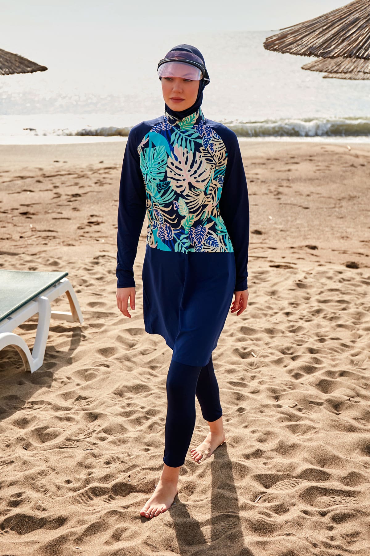 ملابس سباحة محتشمة بوركيني من الليكرا باللون الأزرق البحري M2490