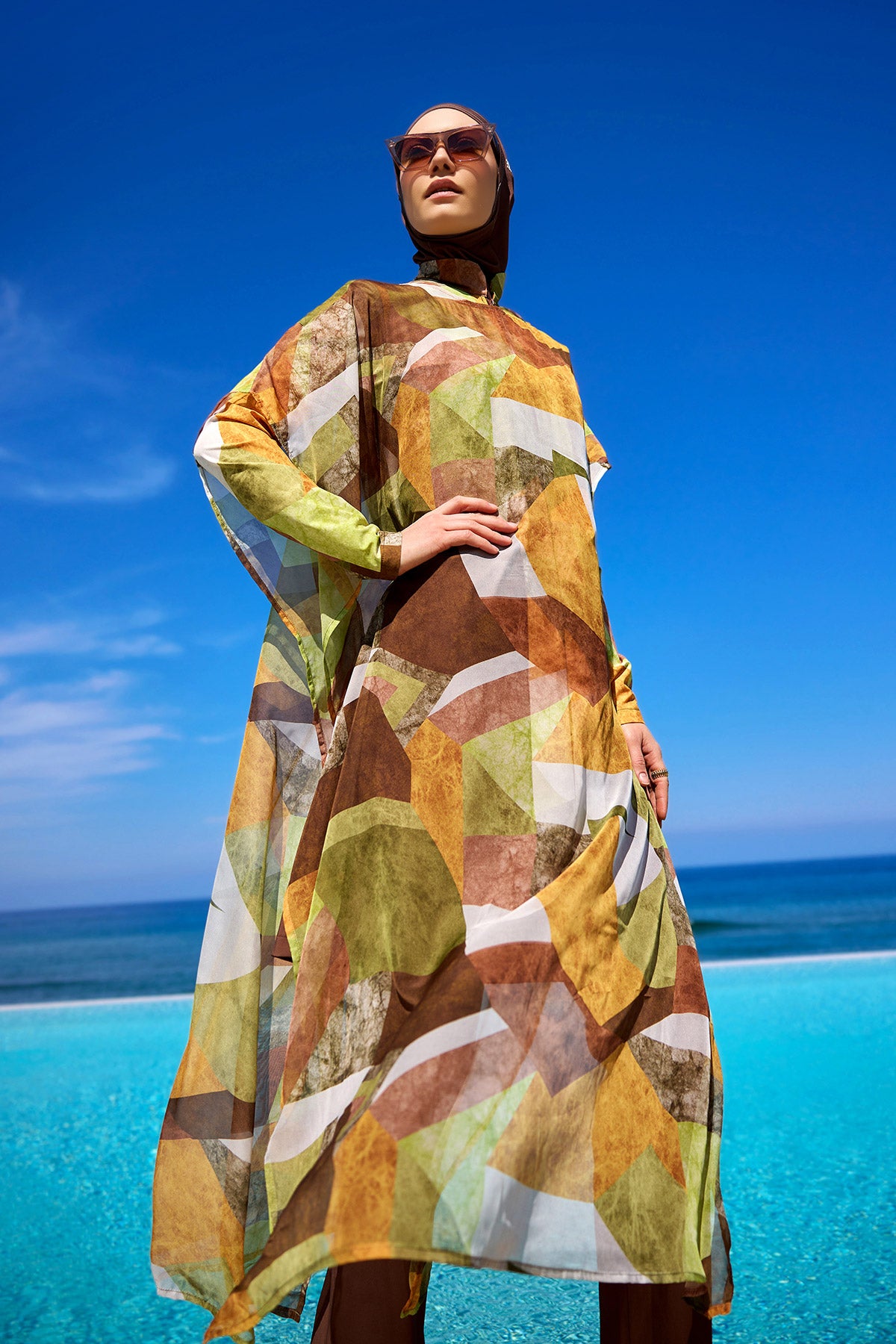 The P2513-1 model dazzles with its soft pattern transitions and color combinations. Its slightly sheer and draped form blends elegance with comfort. This pareo maintains its refined appearance as you transition from the beach to a summer event, offering a relaxed silhouette without clinging to the body.