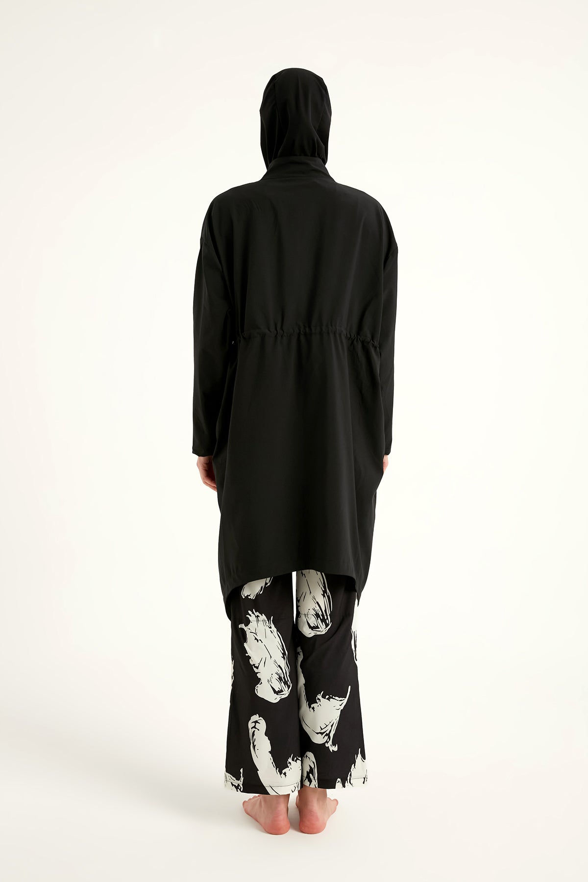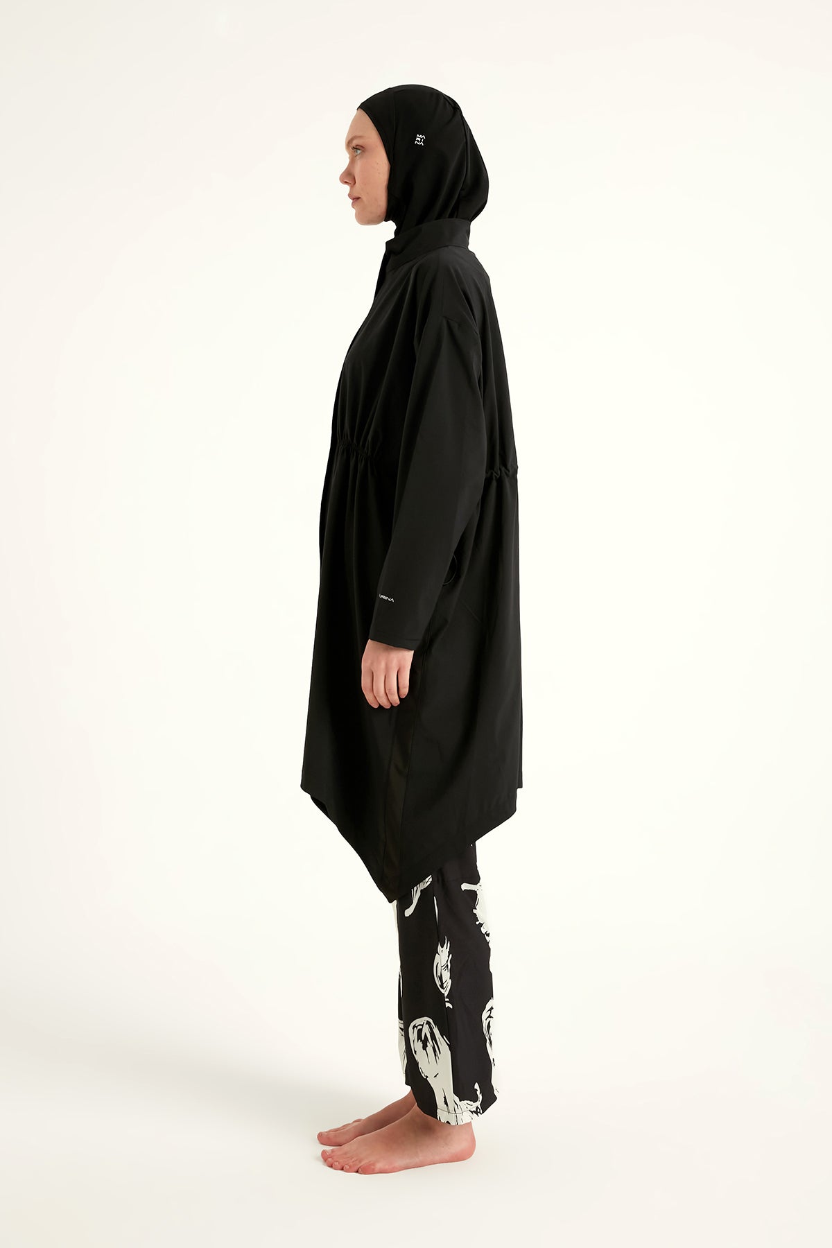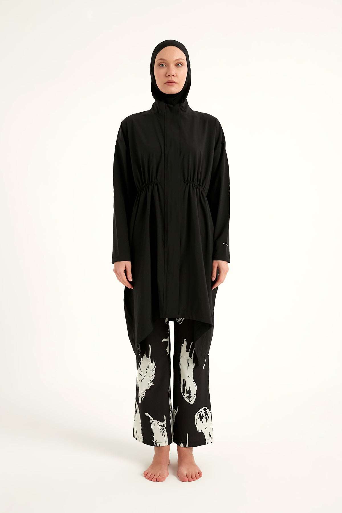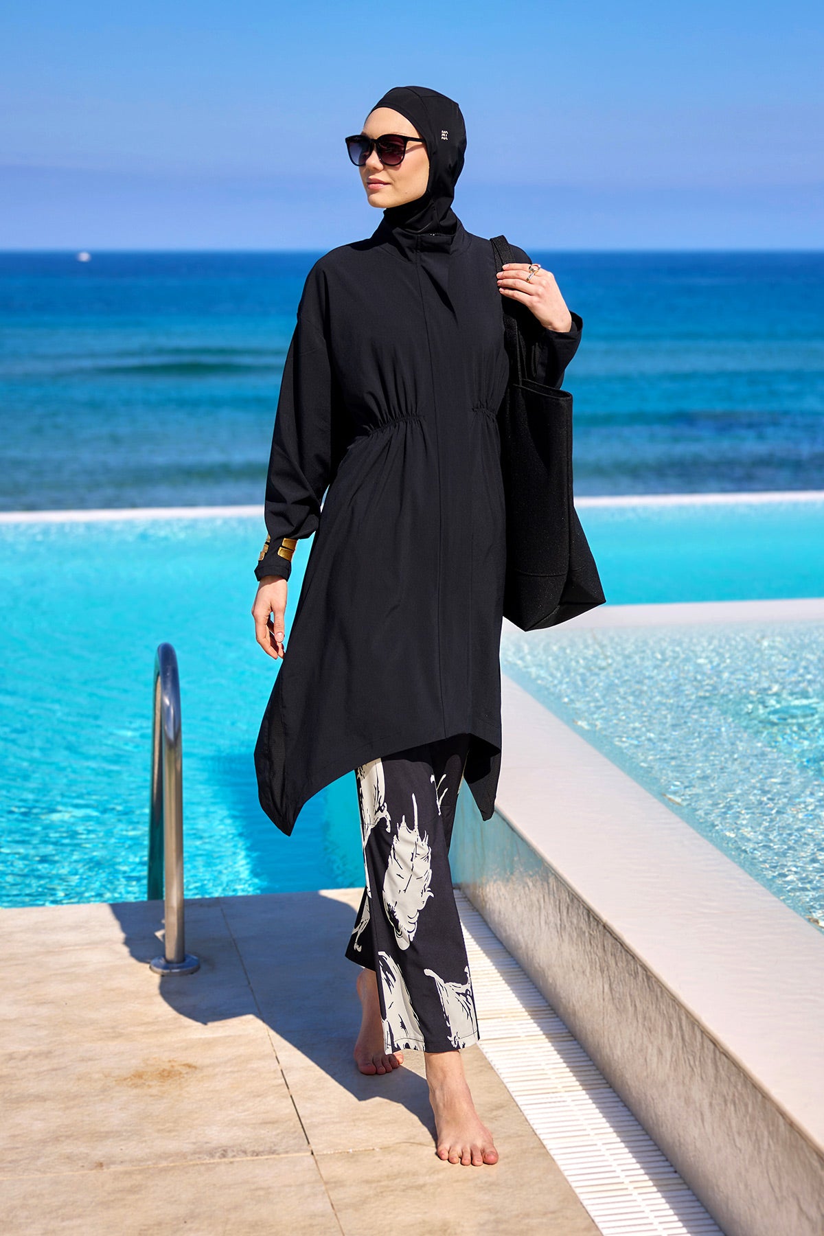 This swimsuit represents the peak of contemporary modest swimwear engineering. The asymmetrical tunic cut introduces an avant-garde elegance, while the concealed snap flap over the zipper echoes a trench coat’s timeless finish. Its wide-leg trousers include built-in tapered leggings underneath for added stability, and a unique inner leg drainage system ensures all-day comfort in and out of the water. Every element has been meticulously designed for performance, fit, and luxury.