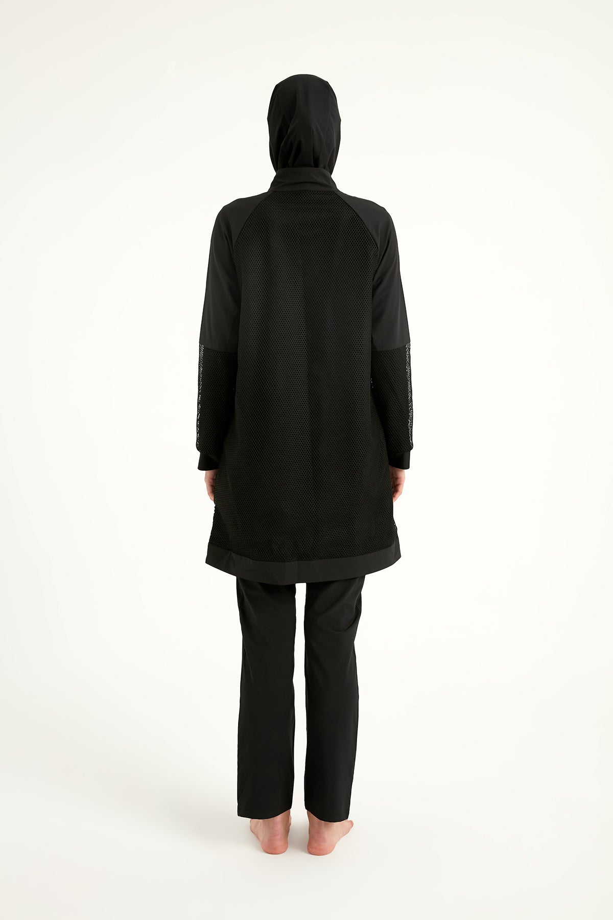 The M2534-1 stands out with its tulle paneling and structured high neck, bringing haute couture energy into the world of modest swimwear. A decorative pocket element elevates the aesthetic while offering subtle functionality. Crafted for women who seek a confident, elegant silhouette both in and out of the water, this piece blends avant-garde design with swim practicality—without compromising modesty or mobility.
